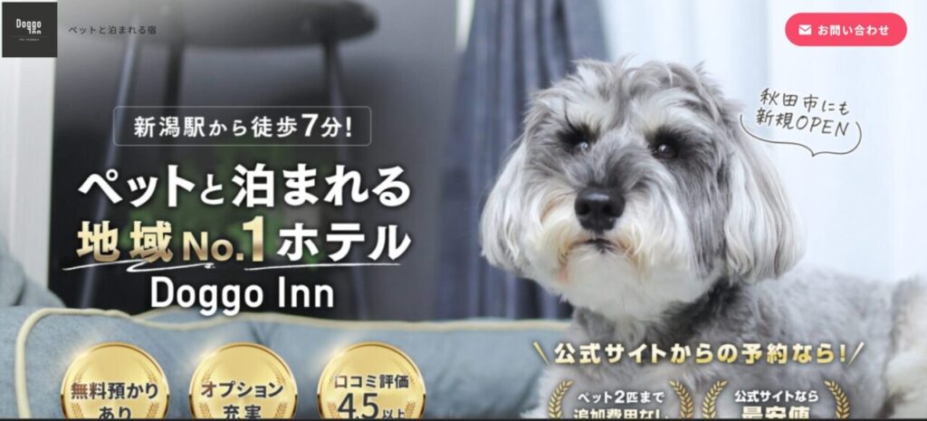 DoggoInnは新潟に続いて秋田にもオープン。 秋田市の繁華街「川反」まで徒歩3分の好立地にあり、観光やショッピングを楽しみたい人におすすめ。