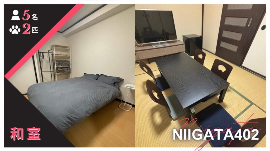DoggoInnのルーム402号室。和室タイプで5名様までお泊まりいただけます。