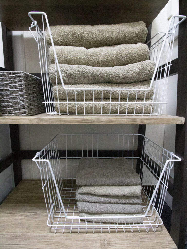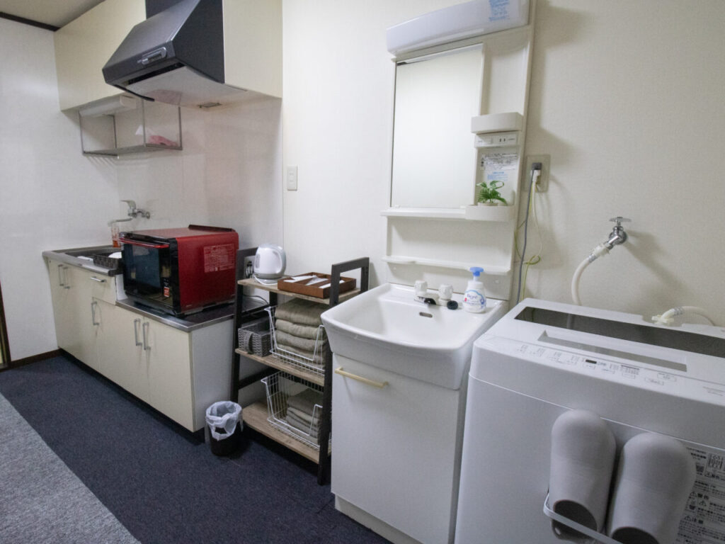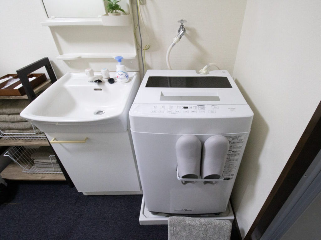 【寝室とランドリ】洗濯機、ハンガー、シーツ、予備の枕と毛布